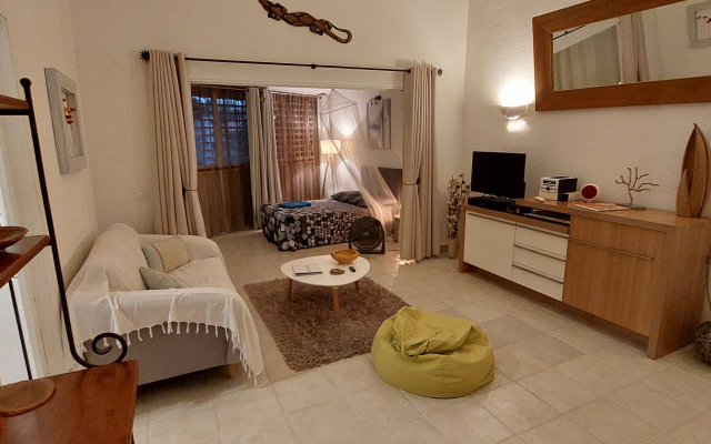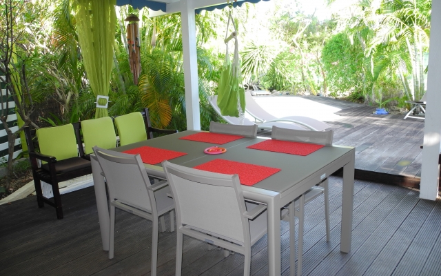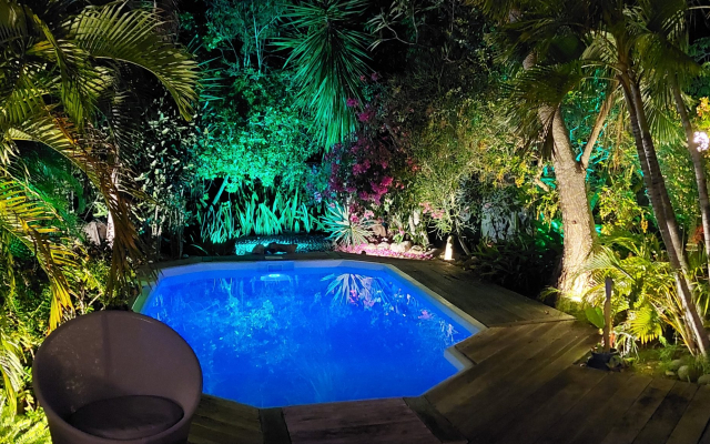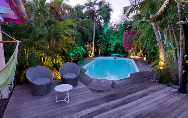 Vous pourrez vous reposer en admirant ce jardin qui le soir vous illuminera de toutes ses couleurs face a l’arbre du fromager (ou Kapokier) sans aucun vis a vis.
