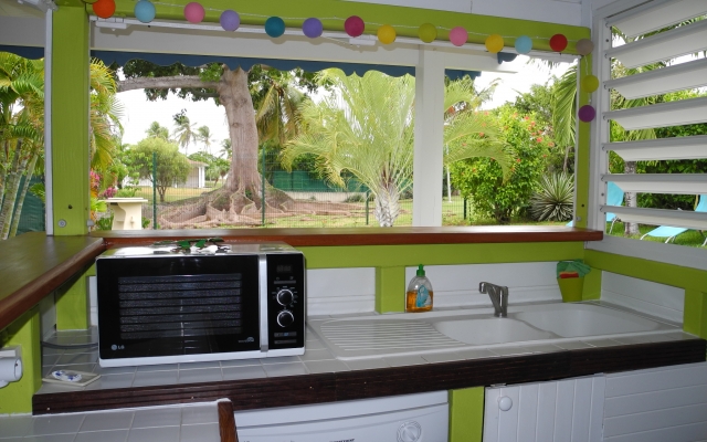 Cuisine extérieure donnant sur le jardin face à la piscine. Très bien équipée : vaisselle, micro-ondes, bouilloire, cafetière Dolce-Gusto, grille pain, lave-vaisselle, four électrique et plaques vitrocéramique, réfrigérateur